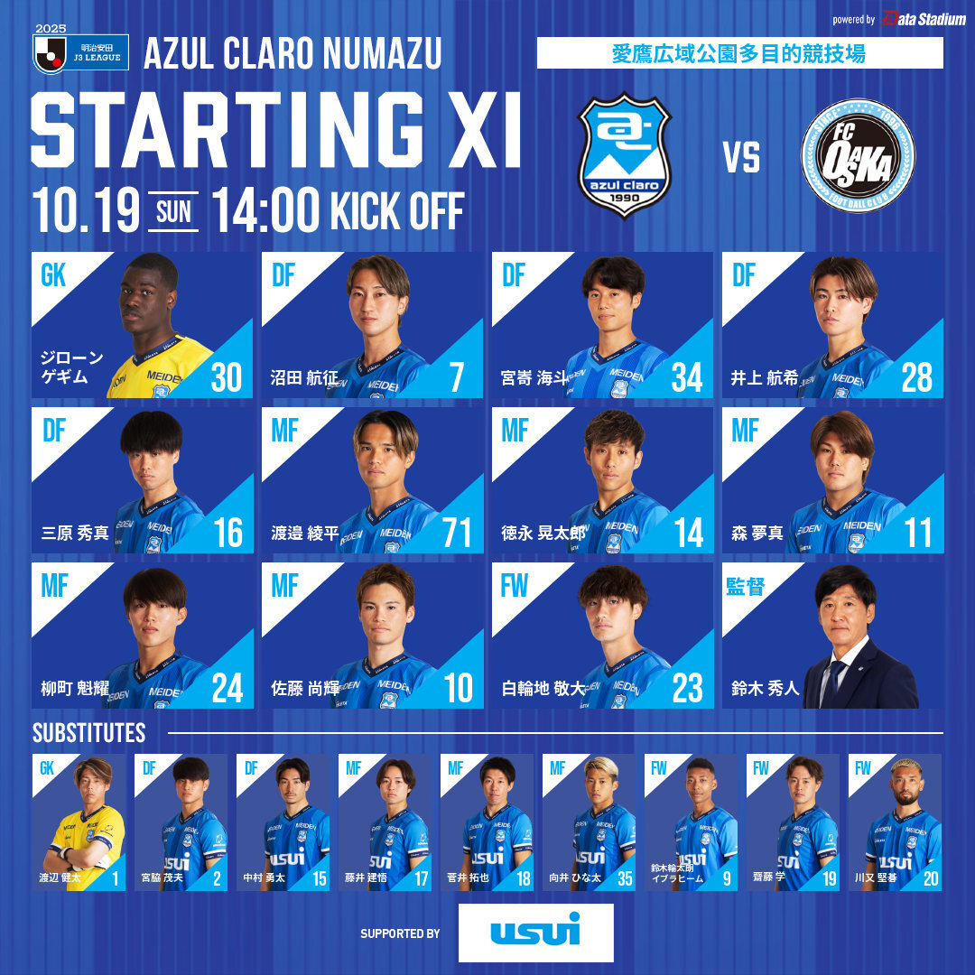 ⚽️|𝗦𝗧𝗔𝗥𝗧𝗜𝗡𝗚 𝗫𝗜 🆚#FC大阪 🗓 10/19 14:00Kickoff 📍愛鷹広域公園多目的競技場 GK #ジローンゲギム DF #沼田航征 #宮㟢海斗 #井上航希 #三原秀真 MF #渡邉綾平 #徳永晃太郎 #森夢真 #柳町魁耀 #佐藤尚輝 FW #白輪地敬大 #アスルクラロ沼津 #結束~全力で闘え~