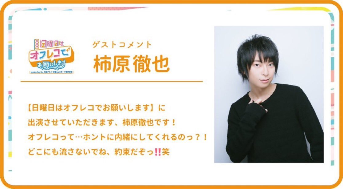 \\📍#日オフ ゲストコメント到着‼️// ゲストの #柿原徹也 さんから 今回のイベントに対するコメントをいただいております!! イベント本番をどうぞお楽しみに✨ #日曜日はオフレコでお願いします #OAS pic.x.com/xMAOswY3RA