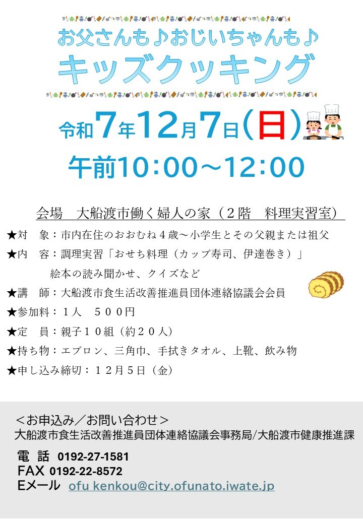 「お父さんも♪おじいちゃんも♪キッズクッキング」で一緒におせち料理を作りましょう🍣 日時:12月7日(日)午前10時~正午 場所:大船渡市働く婦人の家 講師:大船渡市食生活改善推進員連絡協議会 申込はこちらforms.office.com/r/0q04U6UXWS #ofunato #iwate #syoku pic.x.com/G7FktmXjll