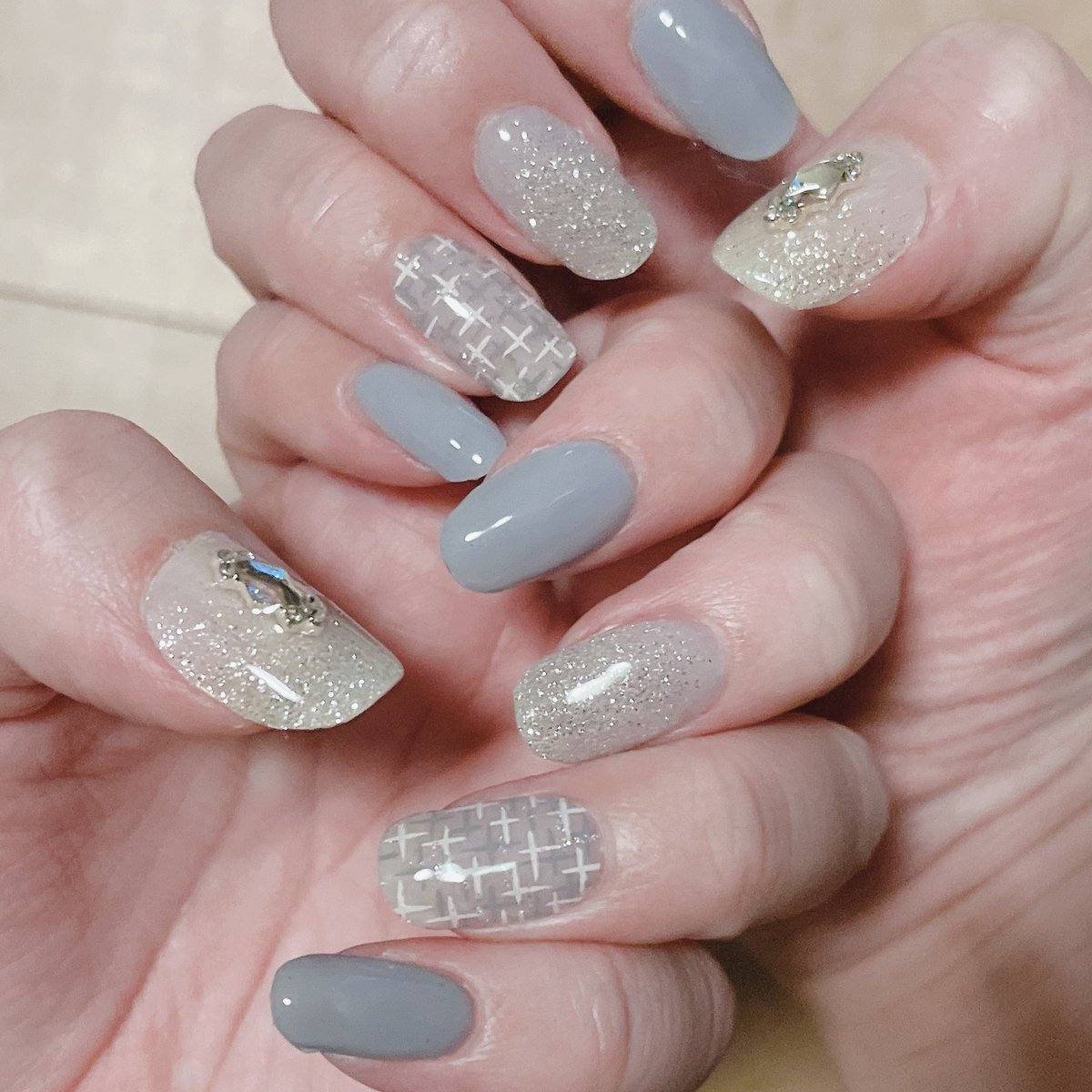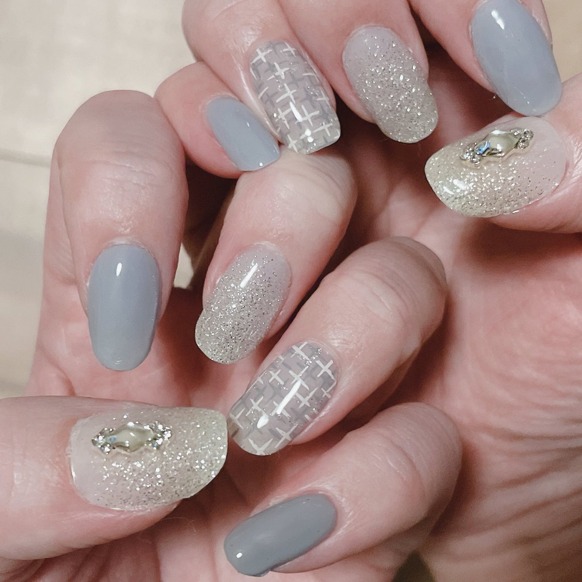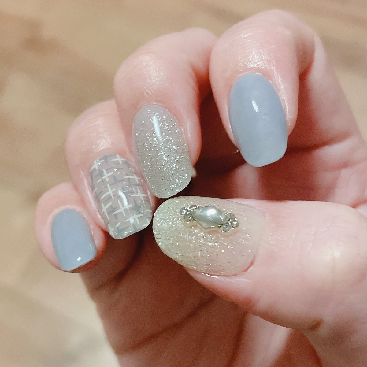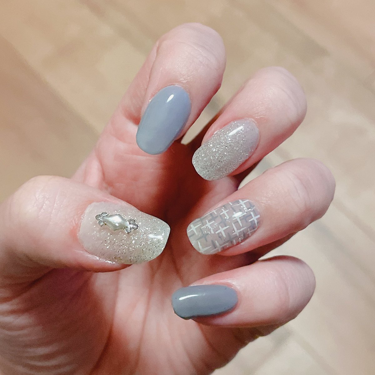 1年分当選品でohoraネイル❄️ これもかわいすぎない…?スモーキーブルーとブルーグレーのラメ、チェック柄に雪の女王みたいなパーツの組み合わせ、とても好きです!!! #ohora #オホーラ pic.x.com/NVDevsVKeR