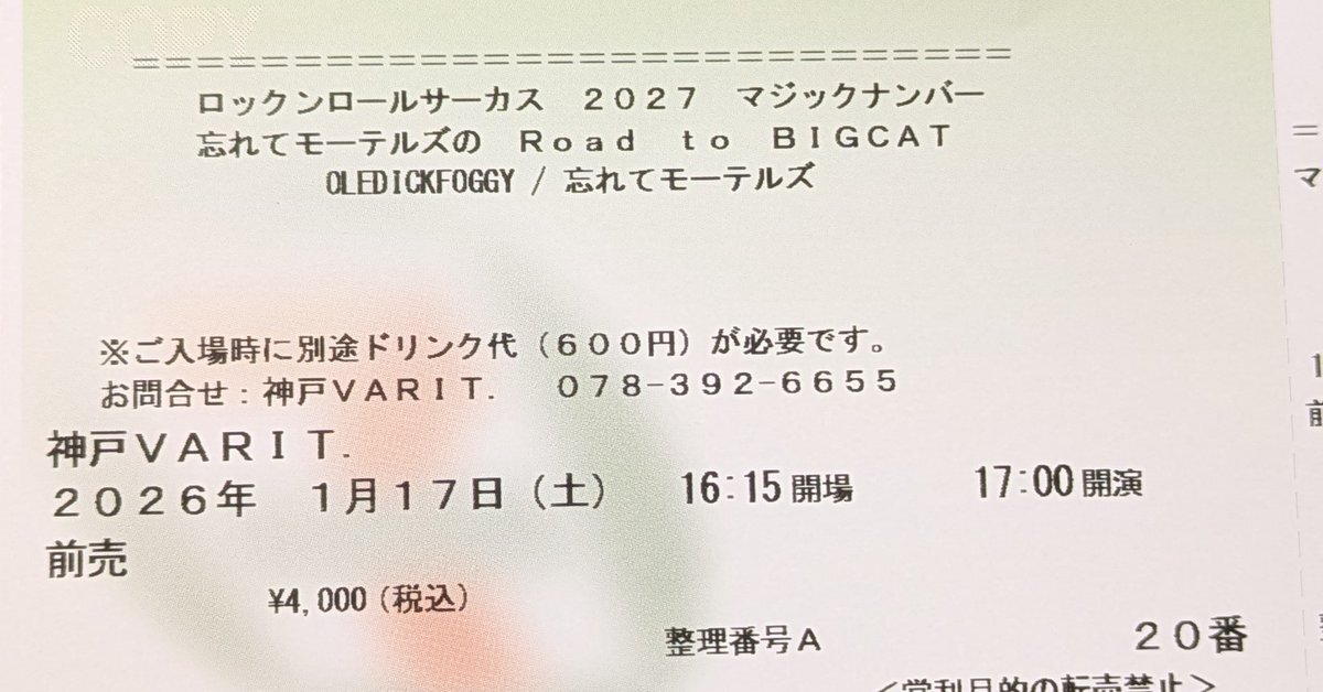 2026年・新春OLEDICKFOGGY詣のチケット取ってきた😆…神戸のライブハウスは初めてかも🤔…忘れてモーテルズさんはこれから予習☺️…楽しみです😃 #OLEDICKFOGGY pic.x.com/SUvAxZ0qGx
