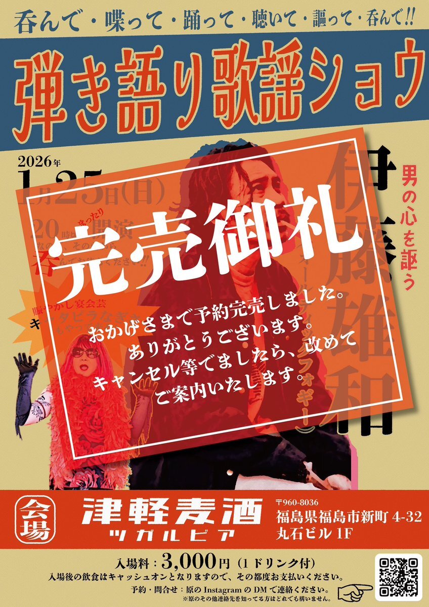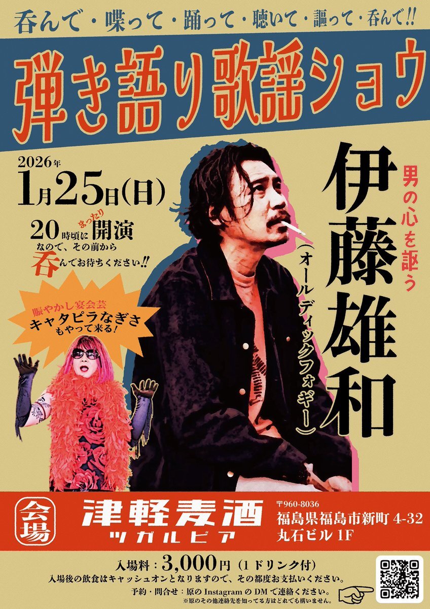 イベントやります🔥 『弾き語り歌謡ショウ』 1/25(日) [場所]津軽麦酒 [時間]飲み始めは何時でも 開演は20時頃 [出演]キャタピラなぎさ/伊藤雄和 @mandolinmetal [料金]3000円(1D付) 予約は私『原』までDMください。 宜しくお願いします🙏 #OLEDICKFOGGY #伊藤雄和 #キャタピラなぎさ #津軽麦酒 pic.x.com/a7nx4kCECt