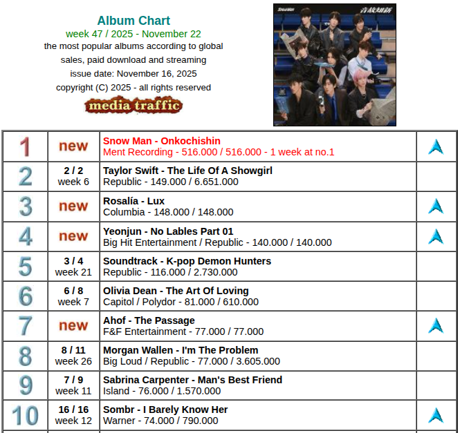Global Album Chart week 47 / 2025 - November 22 'Onkochishin', the 5th studio album by the Japanese idol boy group @SN__20200122, catapults to the pole position of the Global Chart this week with massive 516,000 equivalent sales (all from physical sales) mediatraffic.de/albums.htm