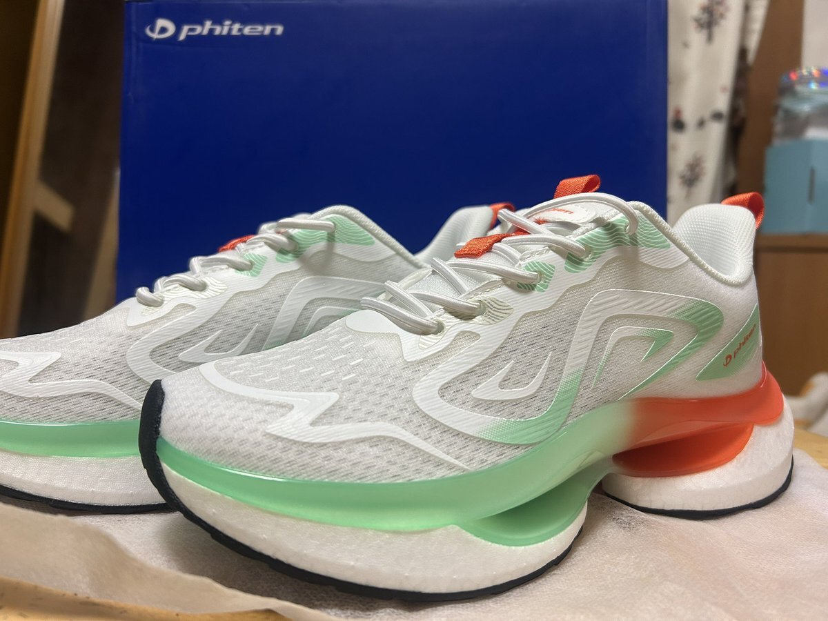 パンパカパーン✨ 念願のファイテンのスニーカーをお迎えしました🎉 愛用中のフワワちゃんもかなりクッション性が高いけど、これはそれよりも上かも。 『ポワリン』と命名しました♪ これをランニング用にしてフワワちゃんを通勤用にするか、さてどうしよう🤔 #phiten #ジョグ #ラン pic.x.com/uWzzZMeBeg