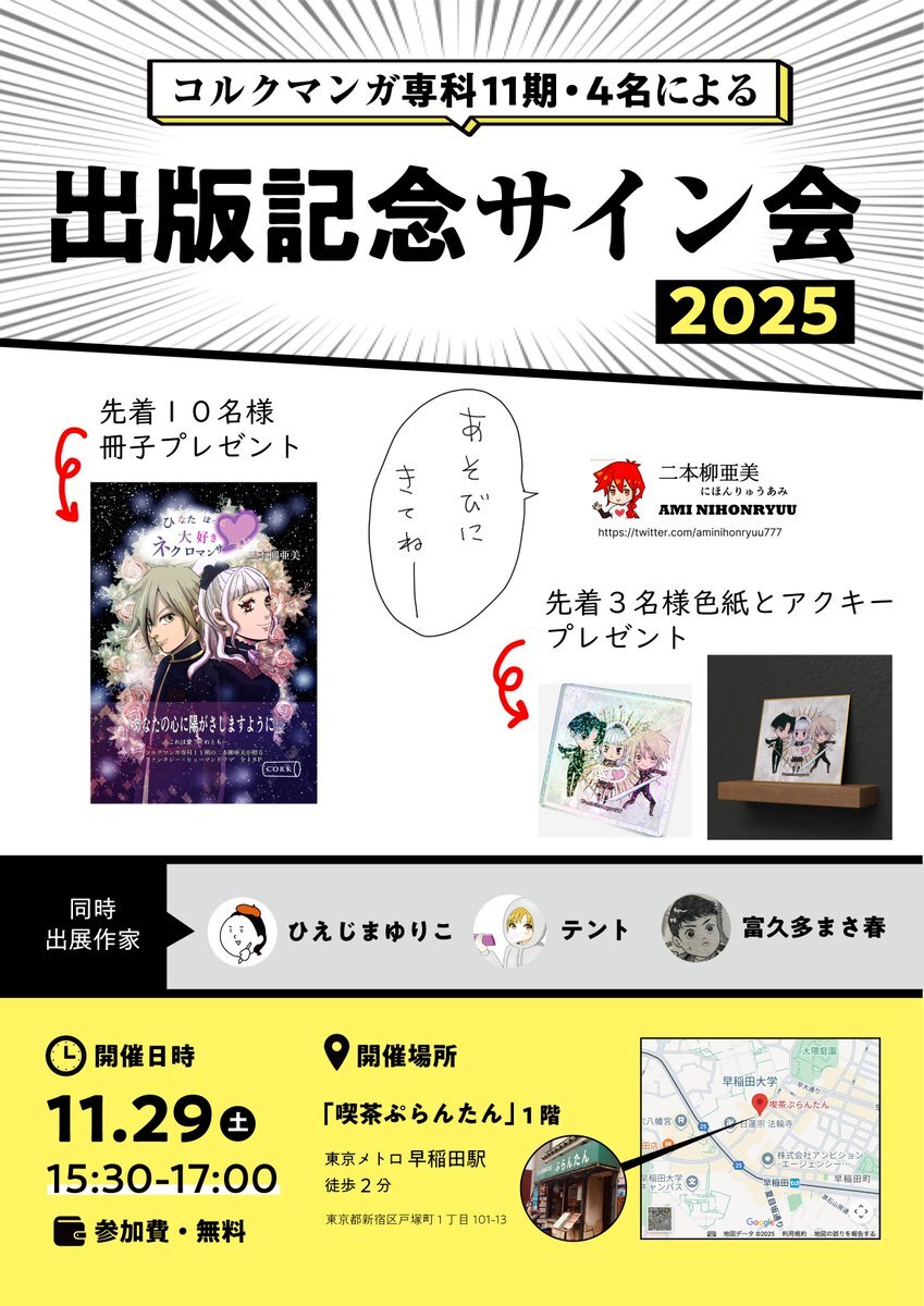 【👻おしらせ🥳】 サイン会します。あそびに来てね💖 ●日程:11/29(土)15:30〜17:00 ●会場:喫茶ぷらんたん(東京メトロ早稲田駅、徒歩2分)1F purantan-waseda.com