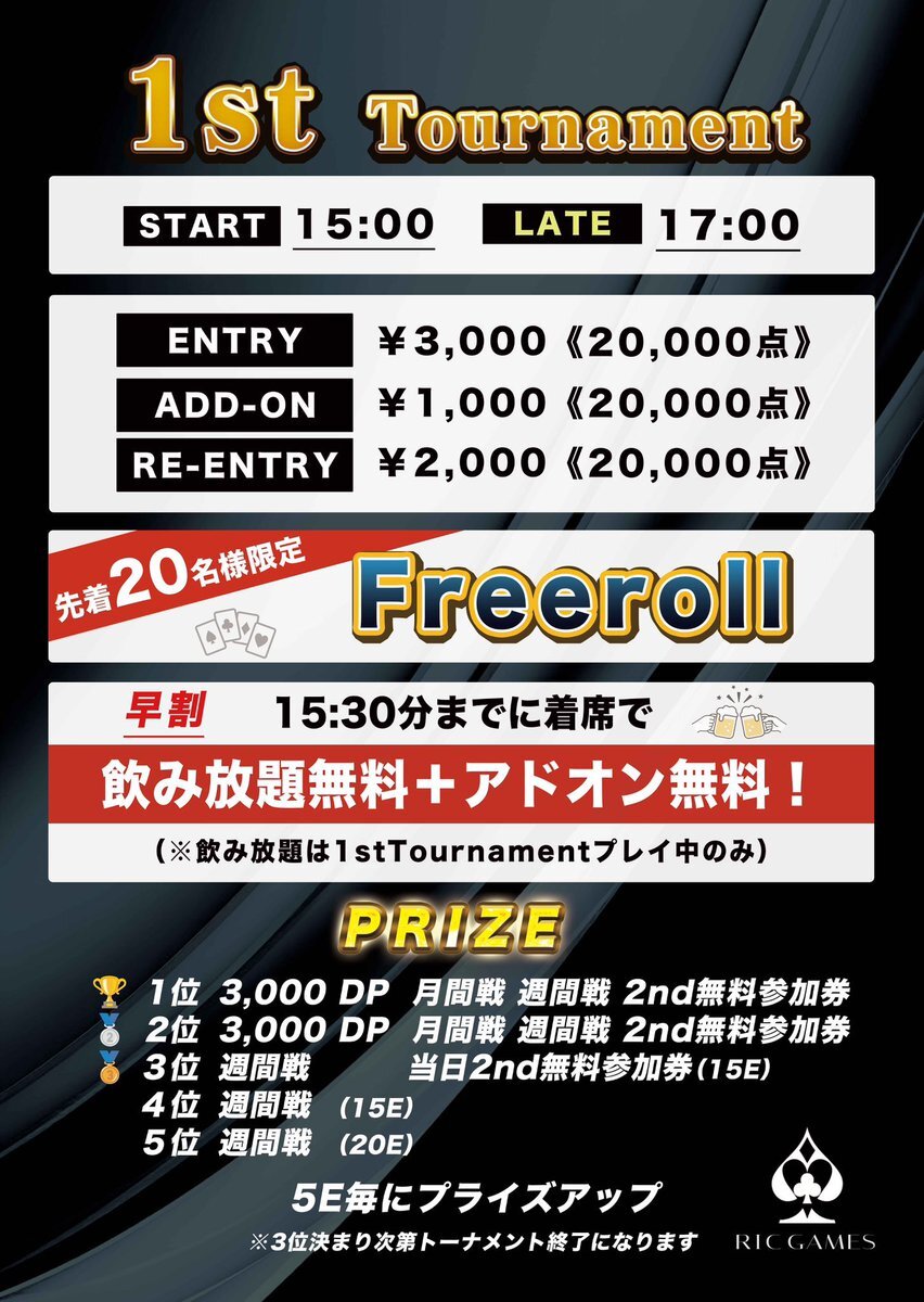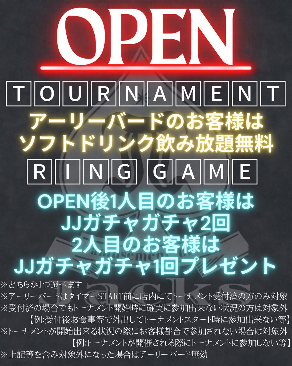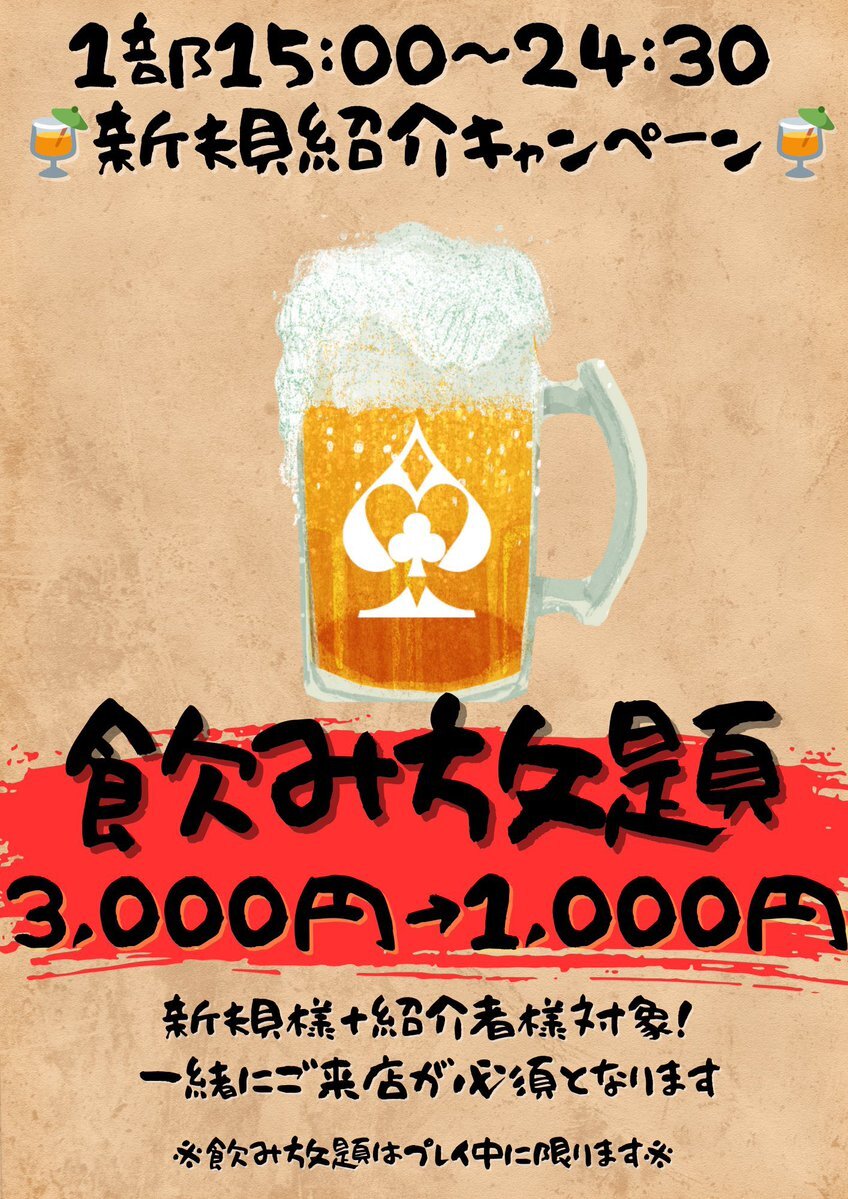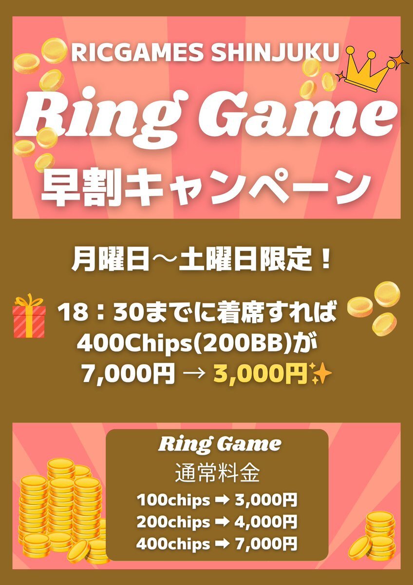 11月限定✨新規キャンペーン‼️ ①リング早割👉18:30までに着席で 400chips(200BB) 💰7,000円→3,000円(日曜除く) ②新規紹介キャンペーン👉 新規&紹介者が飲み放題1,000円🍹 #ポーカー #Poker #新宿 #歌舞伎町 #東京 #飲み放題 pic.x.com/DIvoPCNd1M