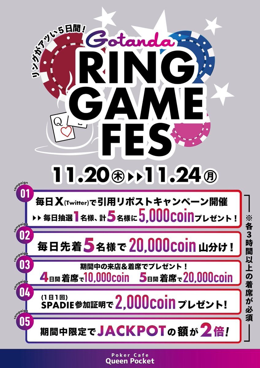 💫毎日引用リポストキャンペーン💫 抽選で1名様に5,000coinプレゼント🎁 11/20(木) 15:00-25:00 【Gotanda Ring Game Fes】に3時間以上の着席🕙 ✅応募締切/発表 11/20(木) 15:00 ✅条件 ①Xアカウントをフォロー ②当ポストにいいね & 意気込みを書いて、引用リポスト x.com/queenpocket_/s…