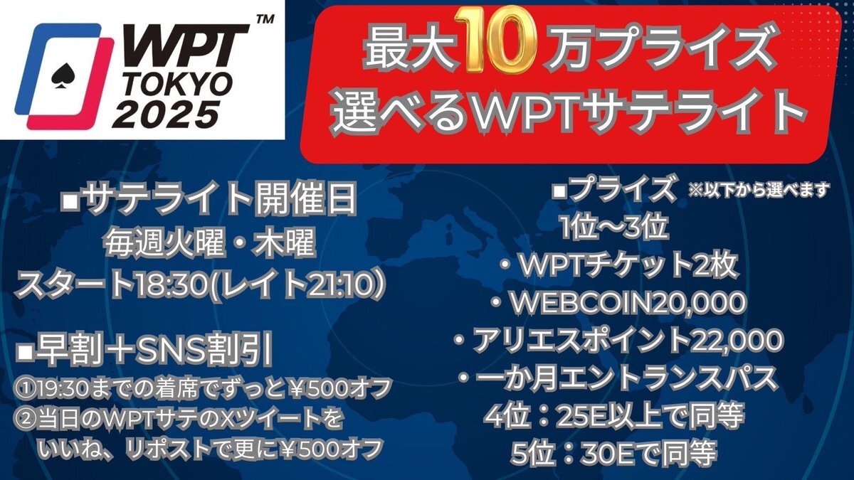 明日11/20(木)のトナメは…… 【最大10万Prize】選べるWPTサテライト メインの賞金総額は1億円⁉️ サテライトでチケットを入手し、メインへの出場権を獲得しよう🔥 ⭐️19:30までの着席でリエントリーもずっと500円引き❗️ ⭐️またこちらのツイートを いいね&リポストで更に500円引き‼️ ⭐️プライズ