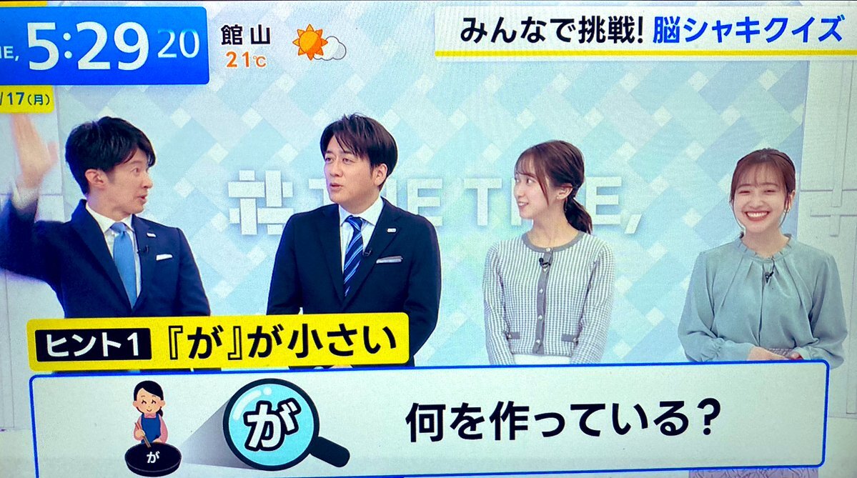安住氏お帰りなさーい♪ 一瞬がが大?と思ったけど が 小さい ですぐ💡 休み明けの安住氏どべの座を珍しくお杉山さんから奪いw #thetime_tbs #脳シャキクイズ #quiz pic.x.com/5f68gwl8C2