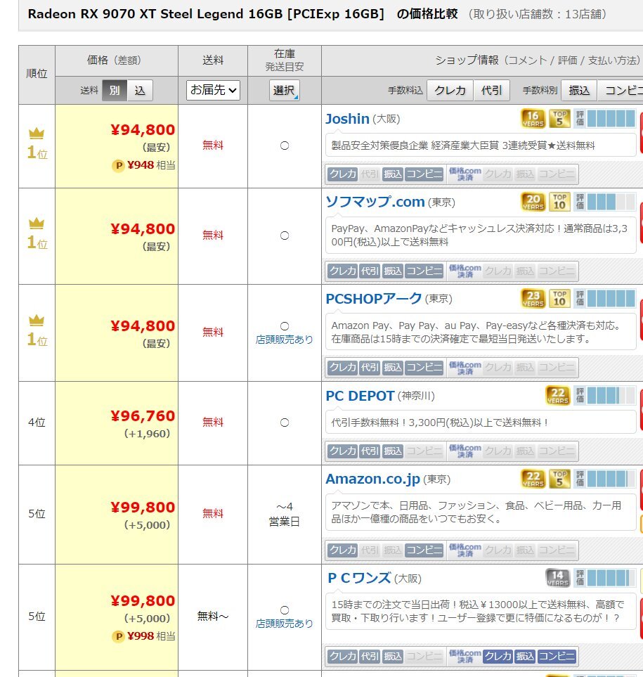 遂に値上げの波がやってきたぞ。 昨日から万桁で上がった。 第二波も来るんだろうなー。 GPUよ。さらばっ。 買っといてよかったGPU。(*´-∀-)ホッ-3 #RX9070XT #ASRock #RAM #AI pic.x.com/r30tmyP97t x.com/LoveLoveAMD/st…