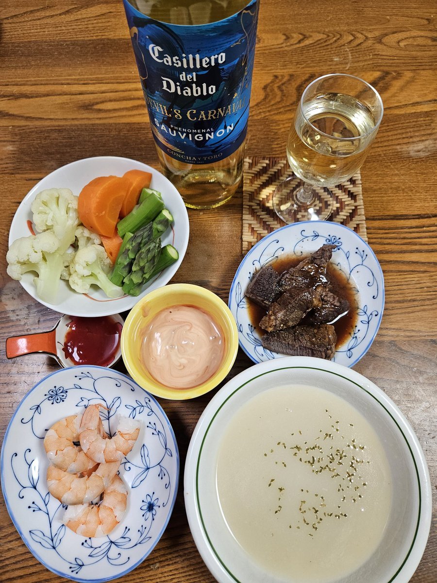 食べたかった #シュリンプカクテル#温野菜のサラダ#暖かいジャガイモスープ、作り置きの #RB。どれも美味しかった。珍しく #安いワインで。甘口だが美味しかったです。満足😄 pic.x.com/nBBVBdqsl0