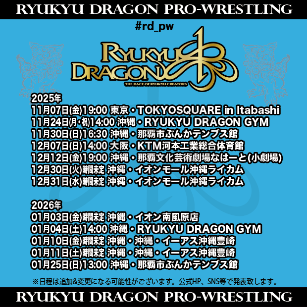 2025年もあとわずか! 琉球ドラゴンプロレス、12月と2026年1月以降の日程です。 20日(土)は沖縄市琉球ドラゴンジムにてHOUSE SHOW、30日・31日は恒例のイオンモール沖縄ライカムイベントプロレス! ご観戦お待ちしております! #rd_pw