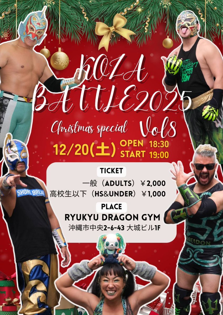 明日は沖縄市琉球ドラゴンジムで19時からハウスショーあるよ!クリスマススペシャル! 大人¥2,000子供¥1,000! キテネ #KOZABATTLE2025 #アップ738 #rd_pw #RYUKYUDRAGONGYM #中央パークアベニュー #元アーモボックス pic.x.com/PIaiwTD3Jk
