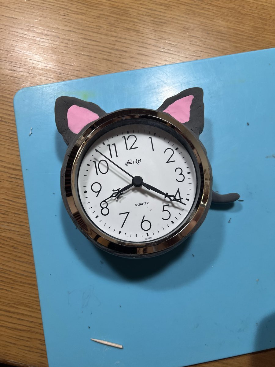 木工の電波時計。捨てようと思い、枠を外したら案外使えそうだったので娘に託してみたら、樹脂粘土で猫の置き時計を作った様だ。 リユース時計完成。 # #時計 #reuse pic.x.com/F6BVbPdxmV