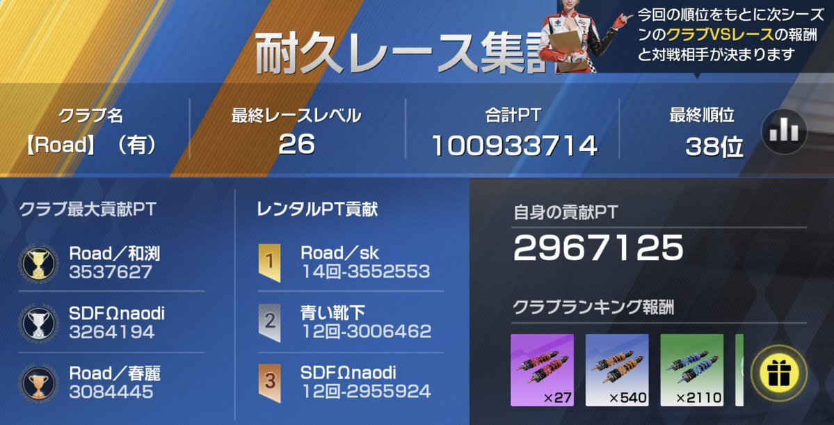 Road 耐久レース おつかれさまでした♪ 38位→27位→31位→38位→49位 ※2代目最高25位 人も減ったし伸び悩みの時期かな? めげずにがんばろ♪ #レーマス #レーシングマスター #Road pic.x.com/9PiiUkckh7
