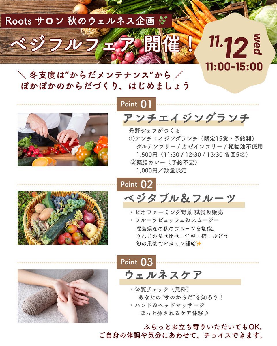 🌿今週11/12(水)開催🌿 Roots「ベジフルフェア」 季節の変わり目、風邪を引いている方が増えてきましたね。今こそからだメンテナンスを✨ 📅11/12(水) 11:00-15:00 📍湯本Roots #いわき湯本温泉 #roots #ベジフルフェア #温活 #いわき #いわき市 instagram.com/p/DQ3hfBckfvx/… pic.x.com/jpNjdK2kLE