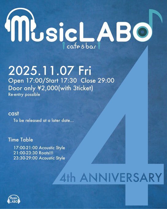 MusicLABOにて周年イベントに Roots!!!で出演させて頂きます‼️ 初めてやりたい事をチャレンジします (暖かく見守ってくれたら幸いです💦) 4周年を皆さんでお祝いしましょう!!🎉 開催日11月07日(金) 場所 MusicLABO ¥2000(3D込) OP17:00〜CL29:00 出番▶︎Roots!!! 21:00~23:30 #Roots #MusicLABO