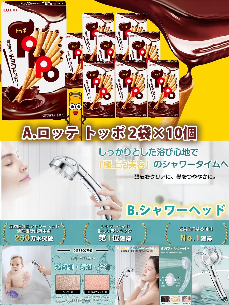 第7⃣4⃣9⃣弾 ☀️その場で当たる 📢\🌈プレゼント・懸賞会/📢 🎁A.🍫ロッテ トッポ 2袋×10個*②名様 🎁B.🚿シャワーヘッド*①⑤名様 ✨フォロー✚RTで当たるチャンス🤲 #その場で当たる #懸賞 🔻 ✅@SundayJP_を #フォロー ✅該当ツイートを #RT ‼️毎日不定期抽選‼️ #フォローリポストキャンペーン pic.x.com/mFAEkqye7k