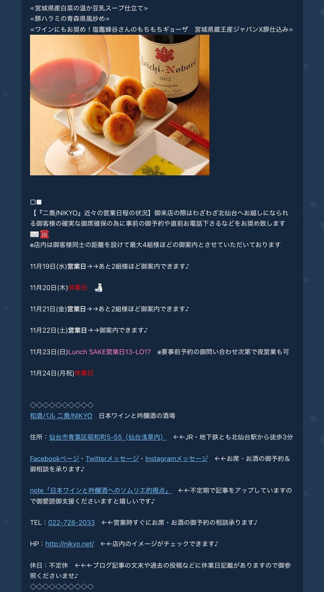 20日(木)『二喬/NIKYO』休業日です。ご確認の上ご足労無きよう、これからも深く楽しめるお酒達🍷🍶🍸🍺🥃をご用意してお待ちしていますので、またのご来店ご愛飲ご支援のほど宜しくお願いいたします。 #和酒バル二喬 #仙台 #仙台浅草 #日本ワイン #SAKE #日本酒 #ソムリエがいる店 #酒ディプロマpic.x.com/B7RXS0AHZS