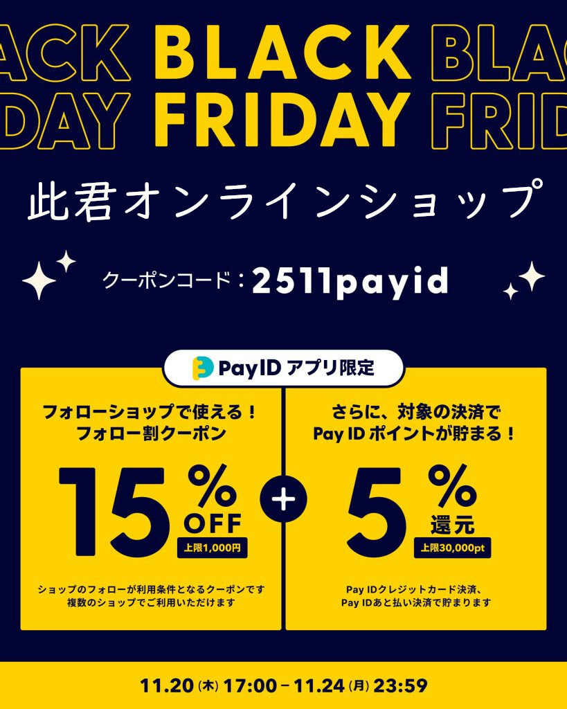 本日17:00スタート! 此君オンラインショップ Pay ID BLACK FRIDAY 2025✨ 【Pay IDアプリ限定】 特典1:フォロー割クーポン・15%OFF(上限1,000円) 特典2:さらに「Pay ID ポイント」5%還元(上限30,000ポイント) #此君 #日本酒 #シクン #しくん #shikun #Sake #payidブラックフライデー pic.x.com/atCajrTwEy