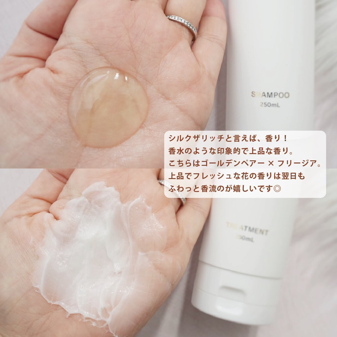 シャンプーは泡立ち良くトリートメントはもちっとした硬めな使用感。 ドライヤーをした後の仕上がりはサラサラな手触りになりました。 ゴールデンペアーとフリージアの香りがほのかに残って香ります。 #シルクザリッチ #SILKTHERICH #SILK #天然シルクのフレグランスヘアケア #ヘアケア #新商品 pic.x.com/bHD4xT5Ddp