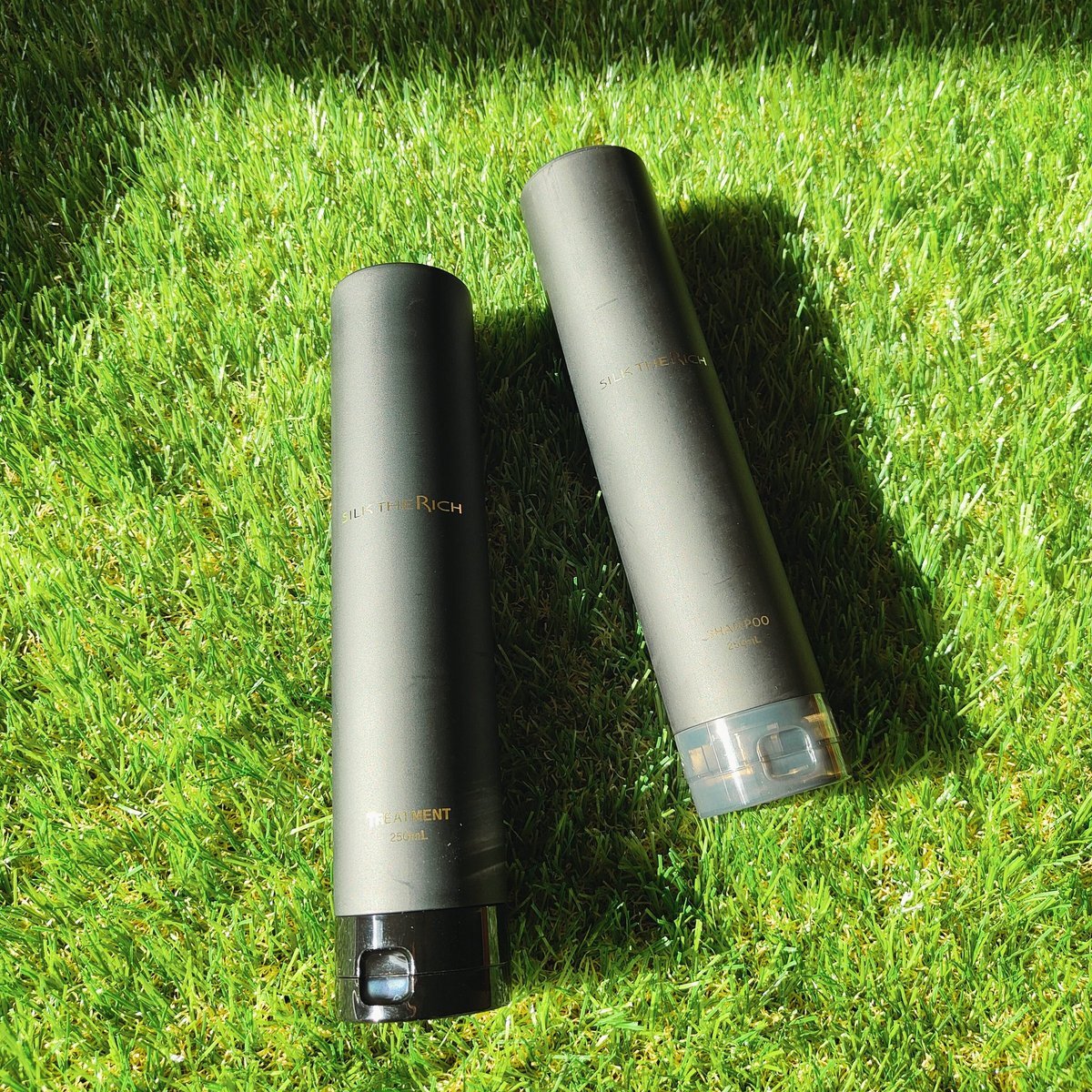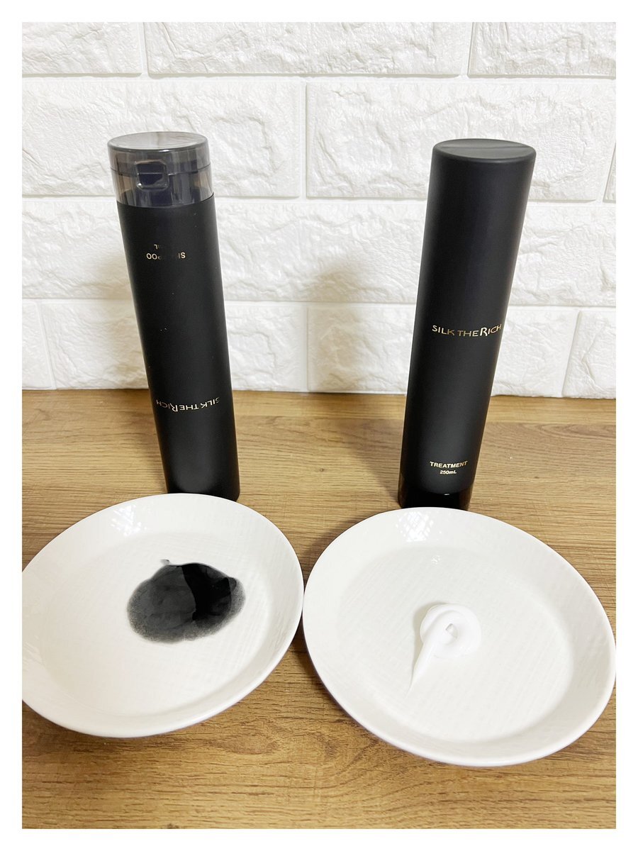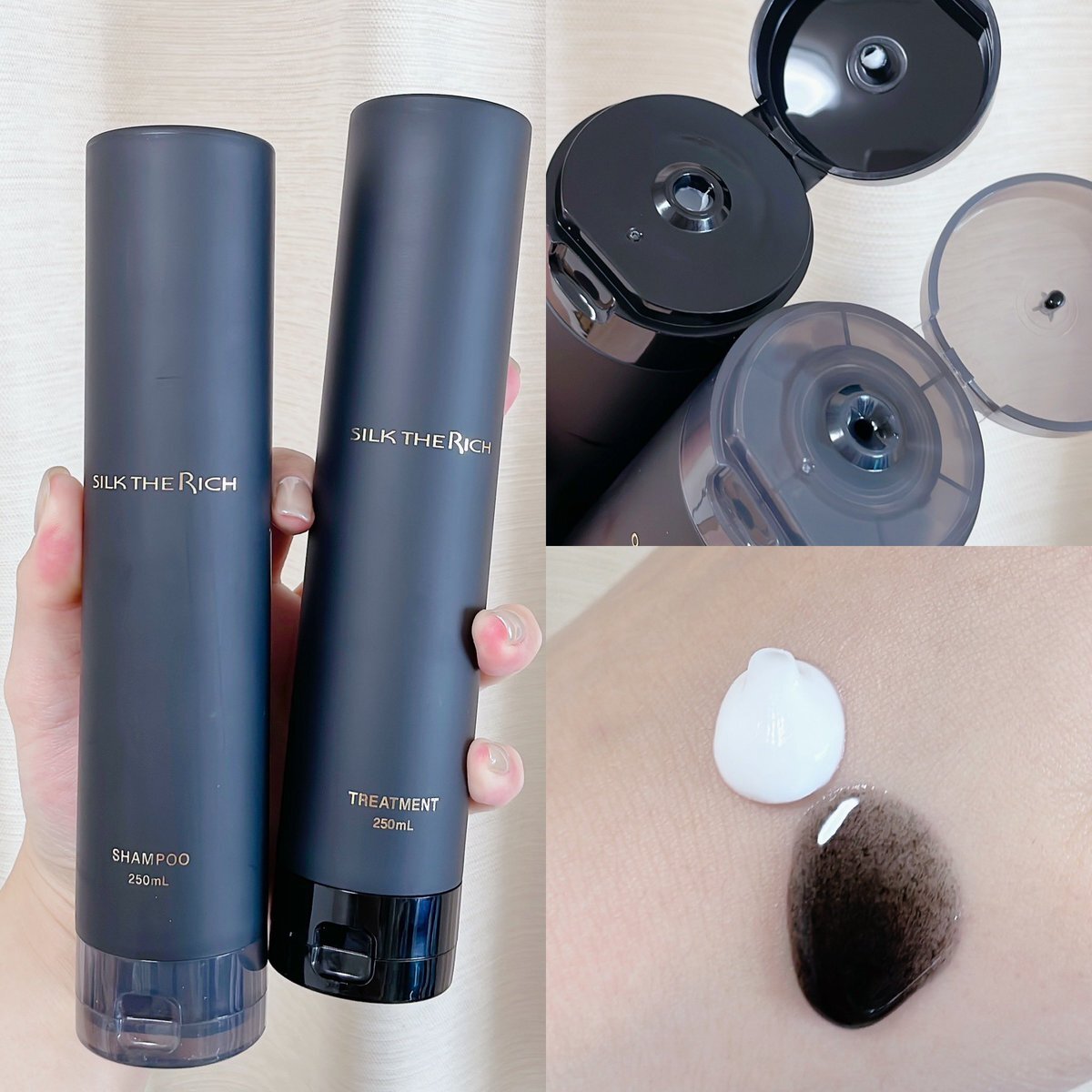 ムスクのすごく良い香りで癒される🌱 シャンプーには炭が配合されており、スカルプケアも一緒にできる😳 トリートメントはこっくりとした重めな質感で髪に馴染ませやすい✨ #シルクザリッチ #SILKTHERICH #SILK #天然シルクのフレグランスヘアケア #ヘアケア #パワーアップした黒金ボトル pic.x.com/Etjv0NBvg4