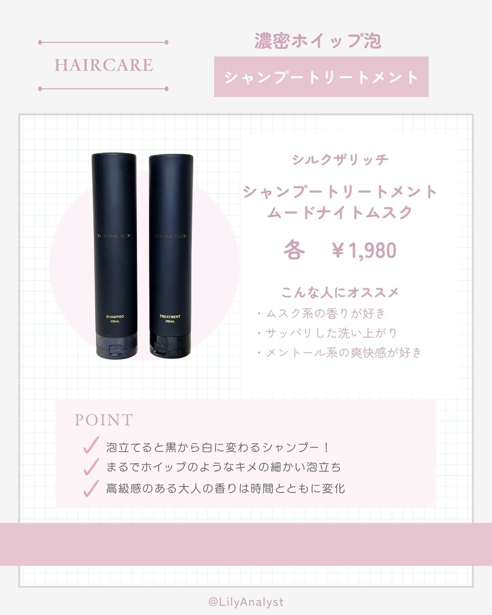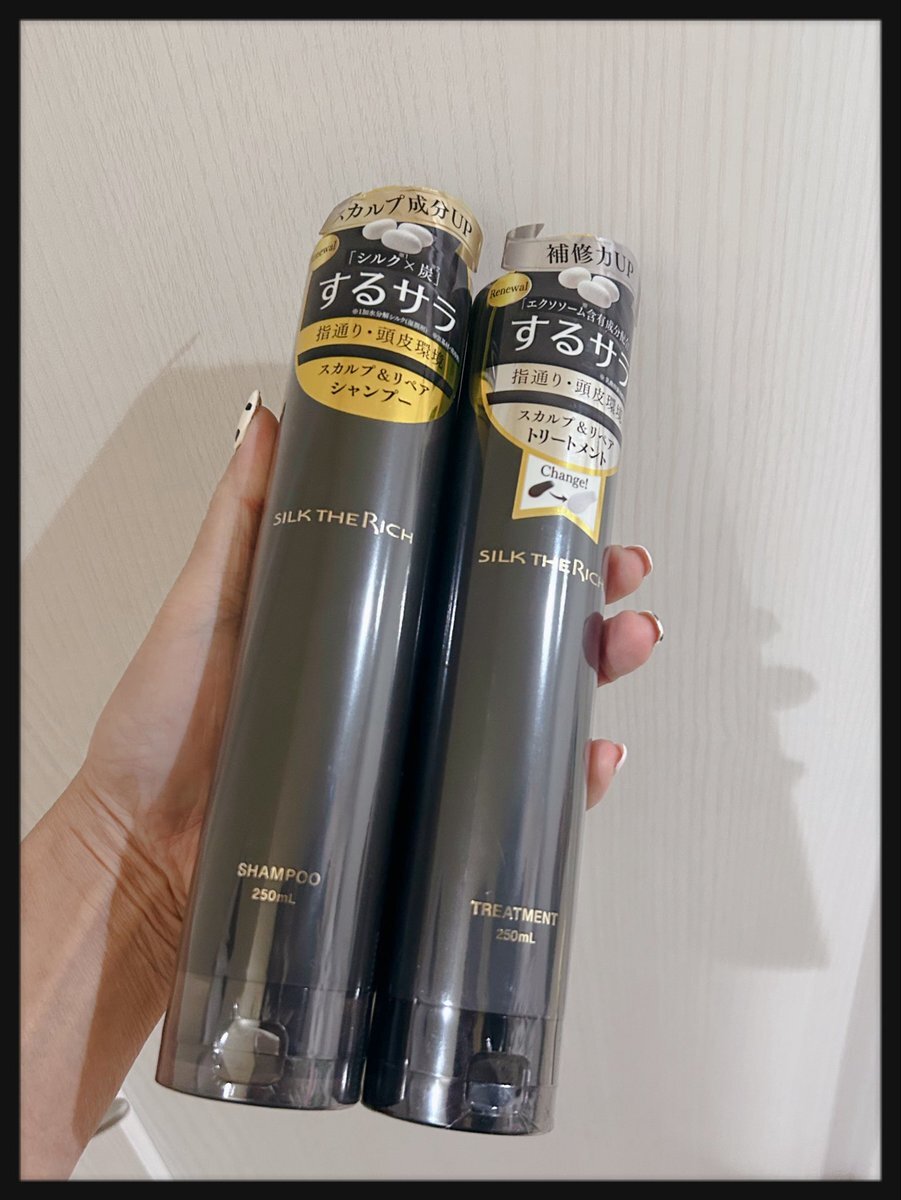 洗い上がりは絡まらずに、ドライヤー後もしっとり感を感じました 香りがムードナイトムスクってことで、めちゃめちゃいい香りです。高級感あります 高級ラインなので大切に使います #シルクザリッチ #SILKTHERICH #SILK #天然シルクのフレグランスヘアケア #ヘアケア #パワーアップした黒金ボトル