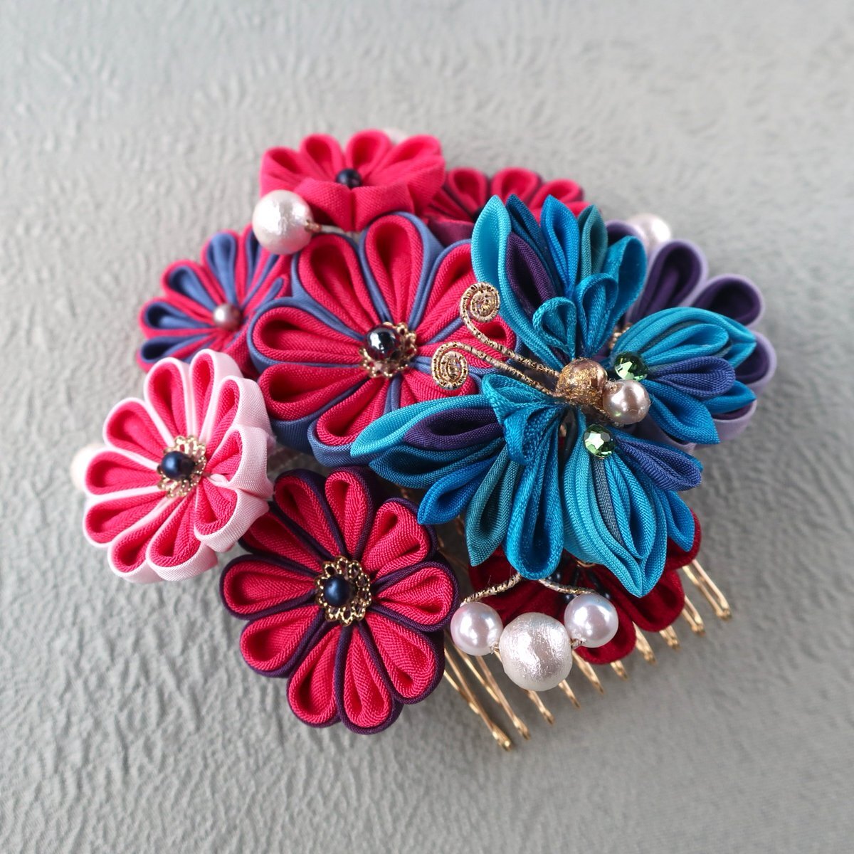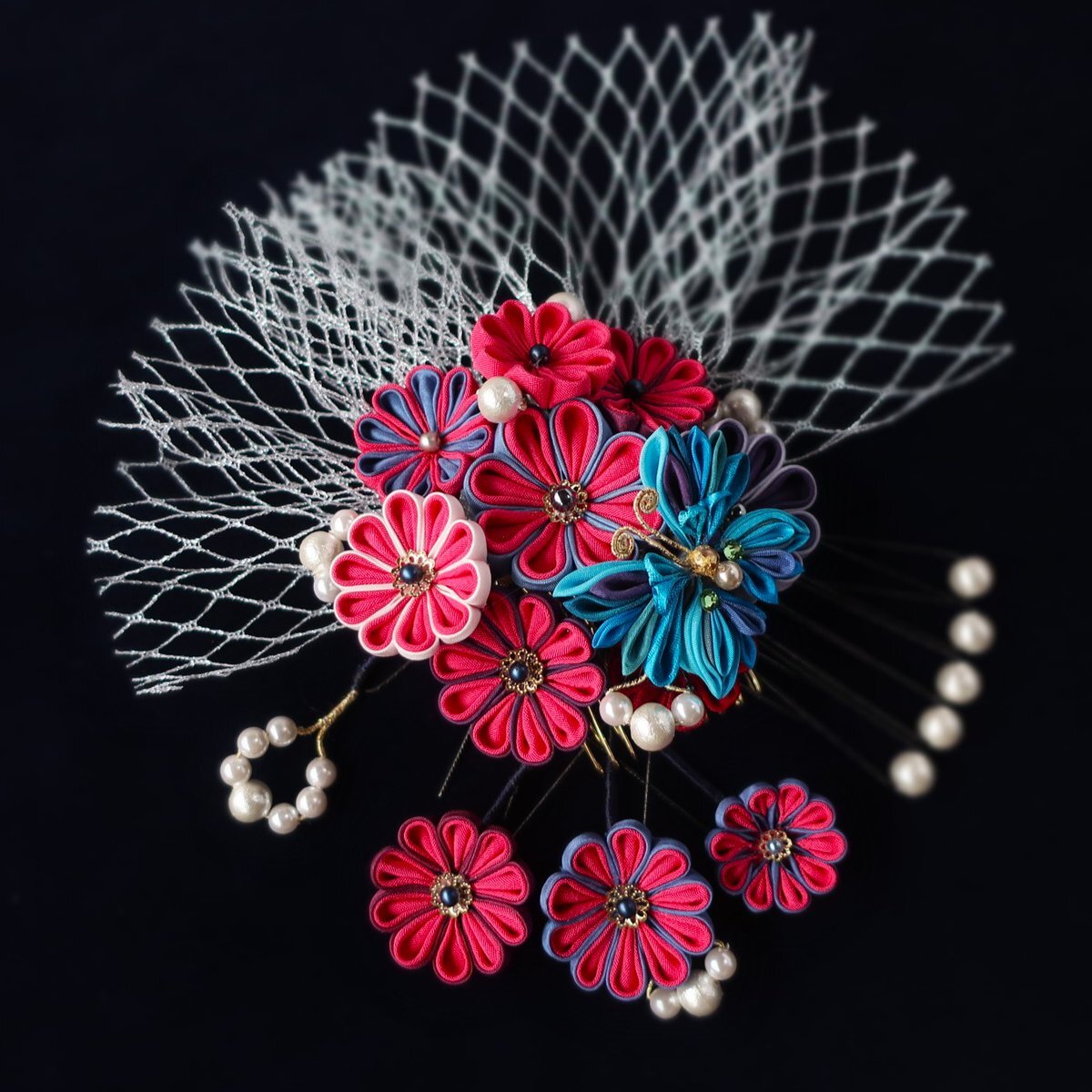 撮影終了しました。背景を黒に変えました。 #成人式髪飾り #かんざし #つまみ細工 #silk 個性的な色合いなので、気に入って下さるのは、少数派かも。以下のサイトに掲載しています。minne.com/items/41466828 creema.jp/item/18432980/… pic.x.com/vG1T6BgKmx