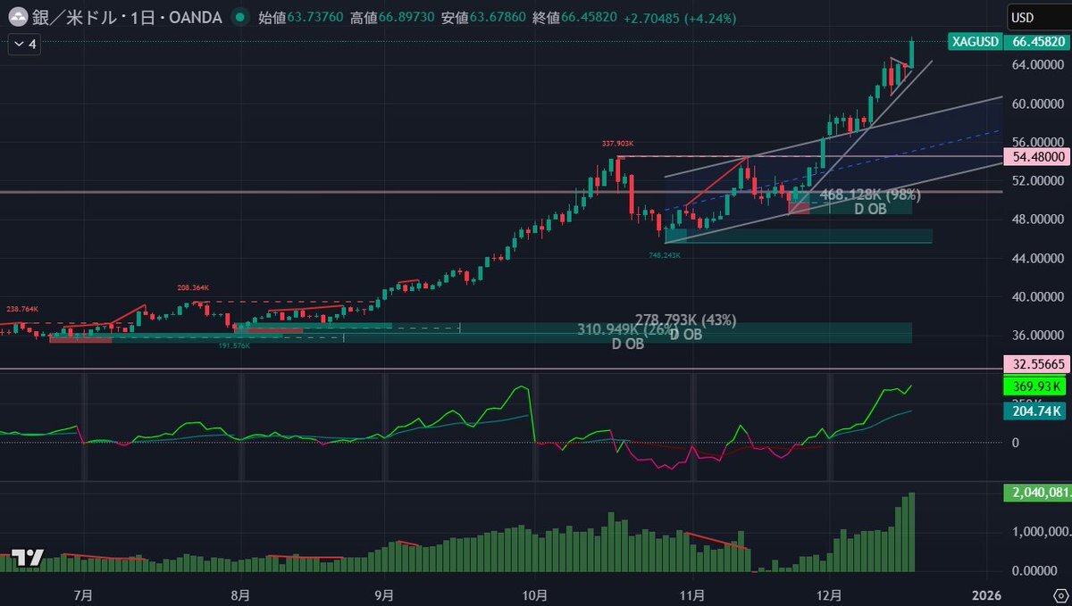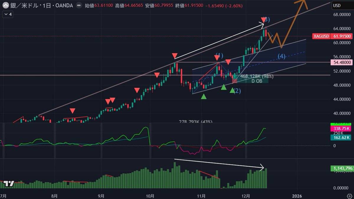 #Silver 4時間足、64.967ロング中です。 ゴールドのブレイク失敗で軟調な展開を予想しましたが、64.6レベルのサポートが分厚く、すぐさま反発しています。 このままブルフラッグのブレイクが成功すれば71~72ドルレベルまで上昇すると予測しています。 pic.x.com/9Os3SCqSDF x.com/cohamizu1/stat…