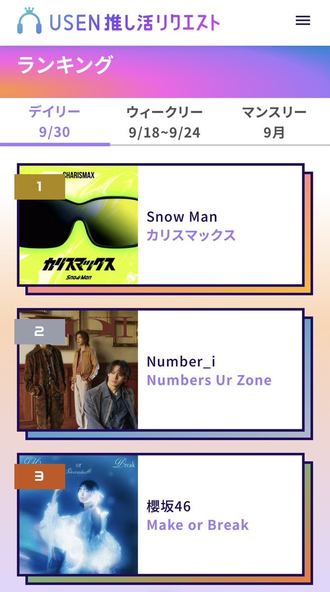 USEN 推し活リクエスト(推しリク) 「2025年9月マンスリーランキング」Snow Man「カリスマックス」が1位!アーティストとしては初のマンスリー1位を獲得! e.usen.com/news/news-unex… #SnowMan #Number_i #櫻坂46 #SB19 #HeySɑyJUMP #ENHYPEN #SxTONES #JO1 #TOMORROW_X_TOGETHER #BEFIRST