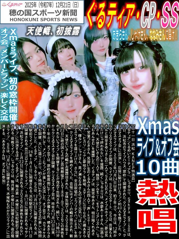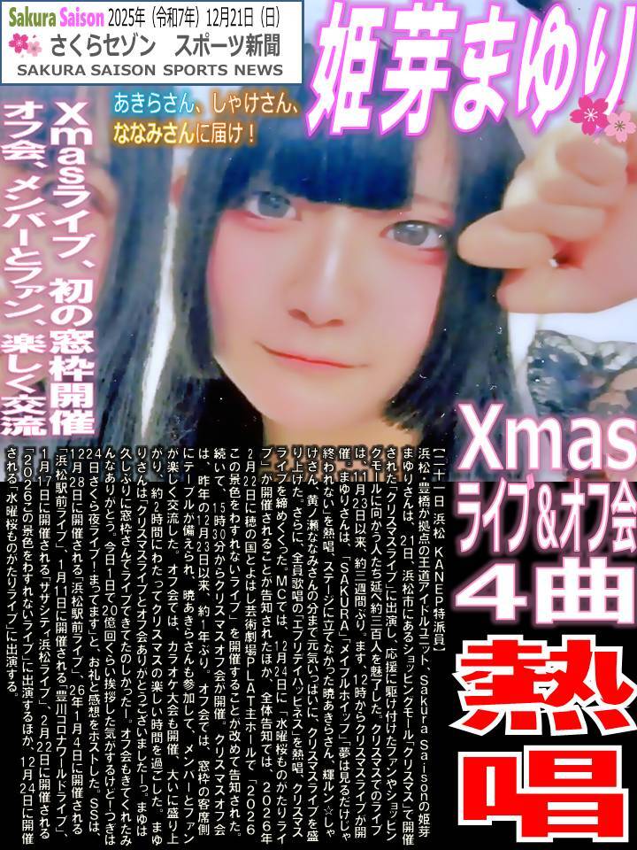 【さくらセゾン スポーツ新聞】 姫芽まゆり クリスマスライブ&オフ会 4曲 熱唱 Xmasライブ、初の窓枠開催 オフ会、メンバーとファン、楽しく交流 あきらさん、しゃけさん、ななみさんに届け ※公式の許可を得て発行 #SS #音葉もえ #姫芽まゆり pic.x.com/7kfXvWHNBI