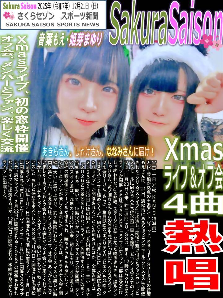 【さくらセゾン スポーツ新聞】 SS 音葉もえ・姫芽まゆり クリスマスライブ&オフ会 4曲 熱唱 Xmasライブ、初の窓枠開催 オフ会、メンバーとファン、楽しく交流 あきらさん、しゃけさん、ななみさんに届け ※公式の許可を得て発行 #SS #音葉もえ #姫芽まゆり pic.x.com/CmvUrEYwUo