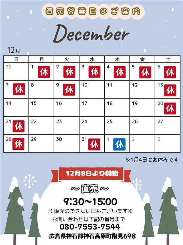 こんにちは!🍓 直売日のカレンダーになります!📅 営業日でも直売を行っていない場合があります お問い合わせは080-7553-7544まで 是非初採れ苺をお買い求め下さい🍓 #神石イチゴファーム #JINSEKI15FARM #神の苺 #いちご #ストロベリー #strawberry #紅ほっぺ #農業ボーイズ #神石高原町 pic.x.com/RmGtXDRzKQ