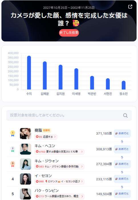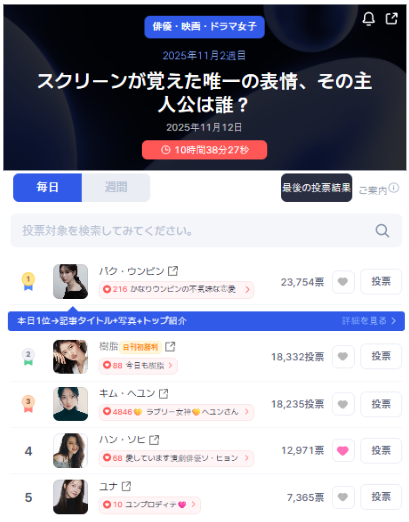 📊 リアルタイムランキング – Startrend 女優・映画・ドラマ(女性)(2025年11月 第2週) スクリーンが記憶したたった一つの表情、その主人公は誰? 🥇 #ParkEunbin – 23,694票 🥈 #Suzy – 18,332票 🥉 #KimHyeyoon – 18,235票 4️⃣ #HanSohee – 12,971票 5️⃣ #Yoona – 7,365票 pic.x.com/sV2rtwW0L4