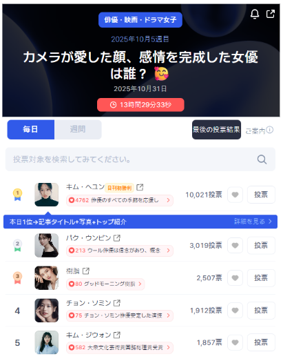 📊 リアルタイムランキング – Startrend 女優・映画・ドラマ(女性)(2025年10月 第5週) カメラが恋した表情と感情を完璧に表現した女優は?🎬💖 🥇 #KimHyeyoon — 10,021票 🥈 #ParkEunbin — 3,019票 🥉 #Suzy — 2,507票 4️⃣ #JungSomin — 1,912票 5️⃣ #KimJiwon — 1,857票 pic.x.com/KIU5IF93tX