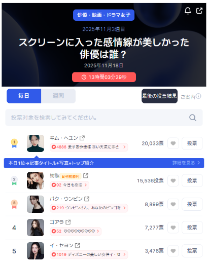 📊 リアルタイムランキング – Startrend 女優・映画・ドラマ (2025年11月 第3週) 画面に映る“美しい感情線”を最も魅力的に描いた俳優は? 👉 startrend.ai/vote/latest/53… 🥇 #KimHyeyoon — 20,033票 🥈 #Suzy — 15,536票 🥉 #ParkEunbin — 8,899票 4️⃣ #GoAra — 7,277票 5️⃣ #LEESEYOUNG — 3,476票 pic.x.com/bCR3vfeqHz