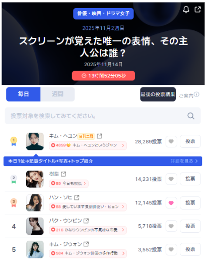📊 リアルタイムランキング – Startrend 女優・映画・ドラマ (2025年11月 第2週) スクリーンが記憶するたった一つの表情、その主人公は誰? 🥇 #KimHyeyoon – 28,289票 🥈 #Suzy – 14,231票 🥉 #HanSohee – 12,145票 4️⃣ #ParkEunbin – 5,718票 5️⃣ #KimJiwon – 3,552票 pic.x.com/hEDfCL8XVD