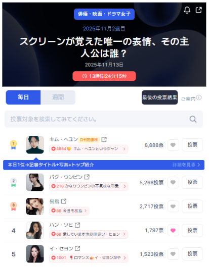 📊 リアルタイムランキング – Startrend 女優・映画・ドラマ(女性)(2025年11月 第2週) スクリーンが記憶したたった一つの表情、その主人公は誰? 🥇 #KimHyeyoon – 8,888票 🥈 #ParkEunbin – 5,268票 🥉 #Suzy – 2,717票 4️⃣ #HanSohee – 1,797票 5️⃣ #KimJiwon – 1,482票 pic.x.com/biZrJ1M5u8