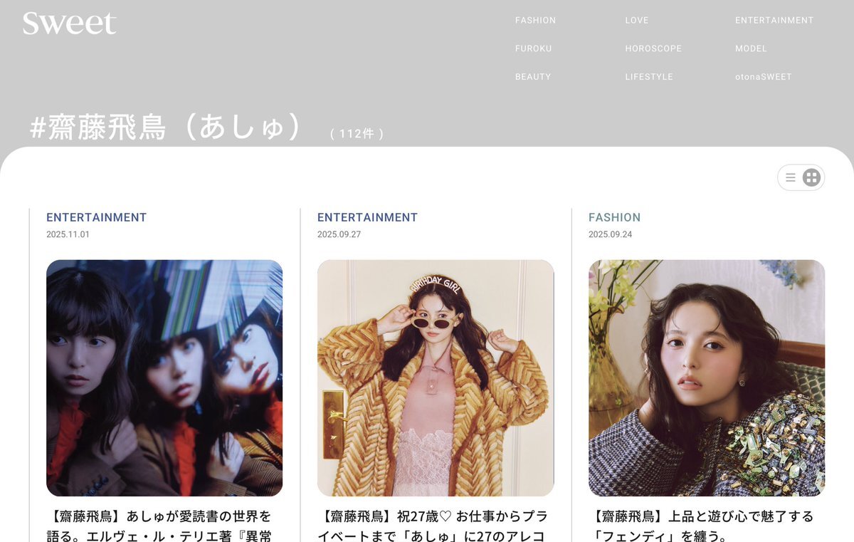 そういえば、ちょっと前からsweet公式サイトの飛鳥さんに関するタグが齋藤飛鳥(あしゅ)に変更されてて、注目検索キーワードにもガッツリ表示される事態になってるんですよね笑 スタッフさんやってますね〜笑 #齋藤飛鳥 #sweet sweetweb.jp pic.x.com/EnYvNiLHac