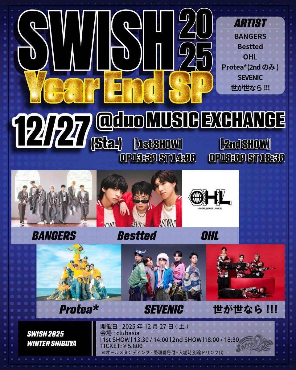 / 2025年12月27日(土) 『SWISH 2025 Year End SP』 開催決定🔥 \ 1st SHOW:OPEN 13:30 START 14:00 2nd SHOW:OPEN 18:00 START 18:30 📍duo MUSIC EXCHANGE (渋谷) 🎫¥5,800-/別D 🔗l-tike.com/order/?gLcode=… 出演:BANGERS/ Bestted/ OHL/ Protea*(2ndのみ)/ 世が世なら!!! …and more!!