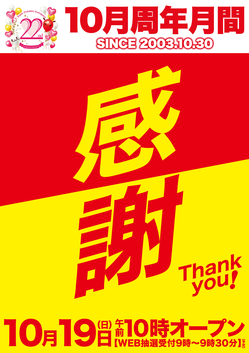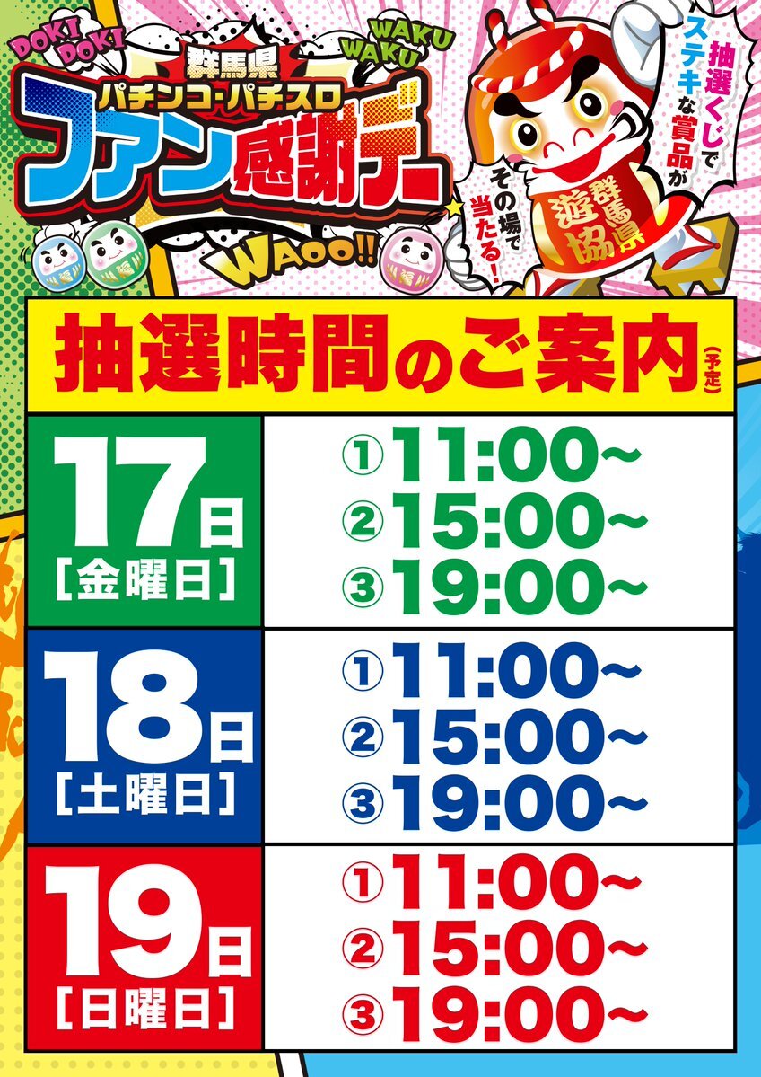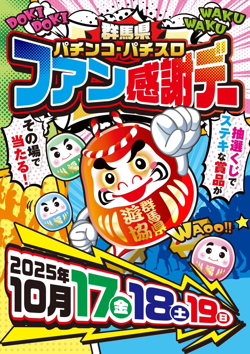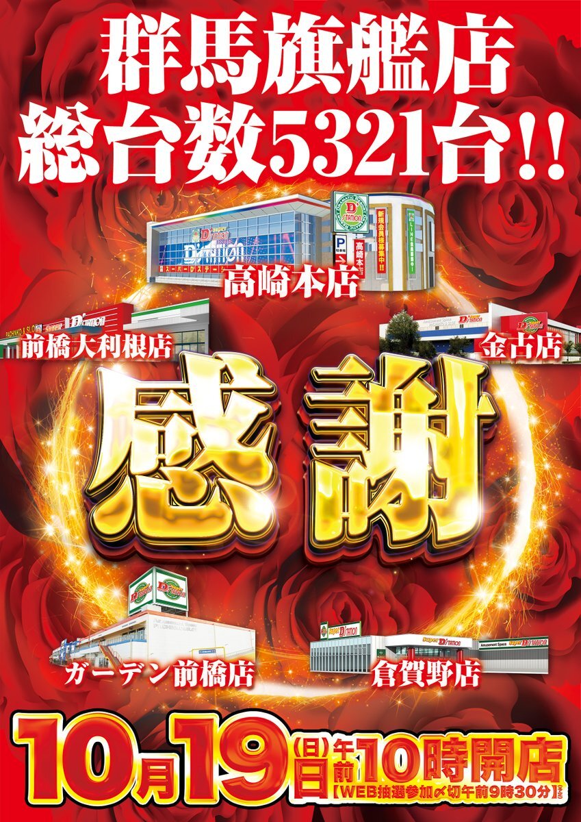 1⃣0⃣月1⃣9⃣日(日) 午前10時開店🕙 🌹日頃のご愛顧に感謝🌹 🎯群馬県パチンコ・パチスロファン感謝デー🎯 🎉本日最終日🎉 ステキな賞品まだまだあります🎁 チャンスは3回💡 本日も皆様のご来店 従業員一同心より お待ちしております✨ #Dステ #金古 #ファン感 #感謝 #ThankYou pic.x.com/gp1WaKAhTj