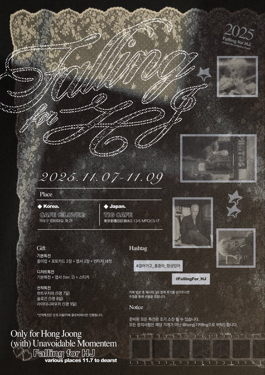 ˚₊‧꒰ა 𝐅𝐚𝐥𝐥𝐢𝐧𝐠 𝐟𝐨𝐫 𝐇𝐉 ໒꒱ ‧₊˚ 2025 #홍중 생일 카페 이벤트 𝟏𝟏.𝟎𝟕-𝟏𝟏.𝟎𝟗 ⊹ ࣪ ˖ 서울 @cafe_cl0ver ⊹ ࣪ ˖ 東京 @tigcafe #걸어가고_홍중이_항상있어 #FallingFor_HJ #ATEEZ #에이티즈 #HONGJOONG