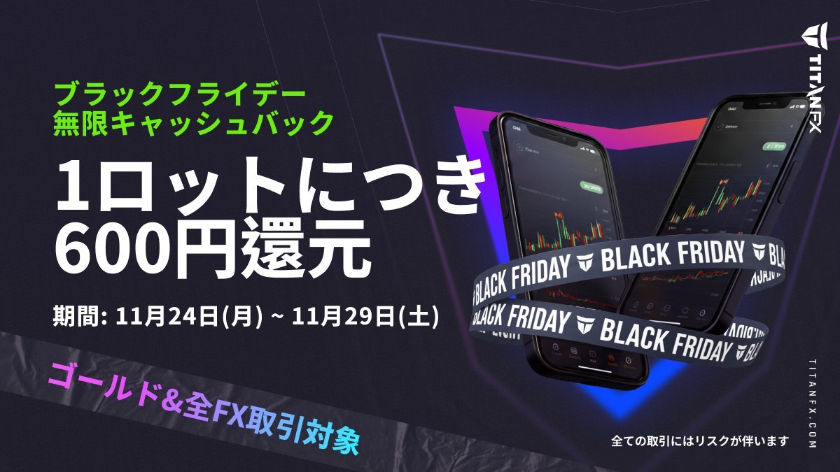 #TitanFX が「本日より」ブラックフライデー無限キャッシュバックのエントリーを開始💡 ・参加登録と入金は本日からOK ・1ロット以上の取引は、「11/24から」行いましょう! 5日間限定、全FXとゴールドが対象銘柄です。 口座タイプによってキャッシュバック単価が異なります。 x.com/TitanFXJP/stat…