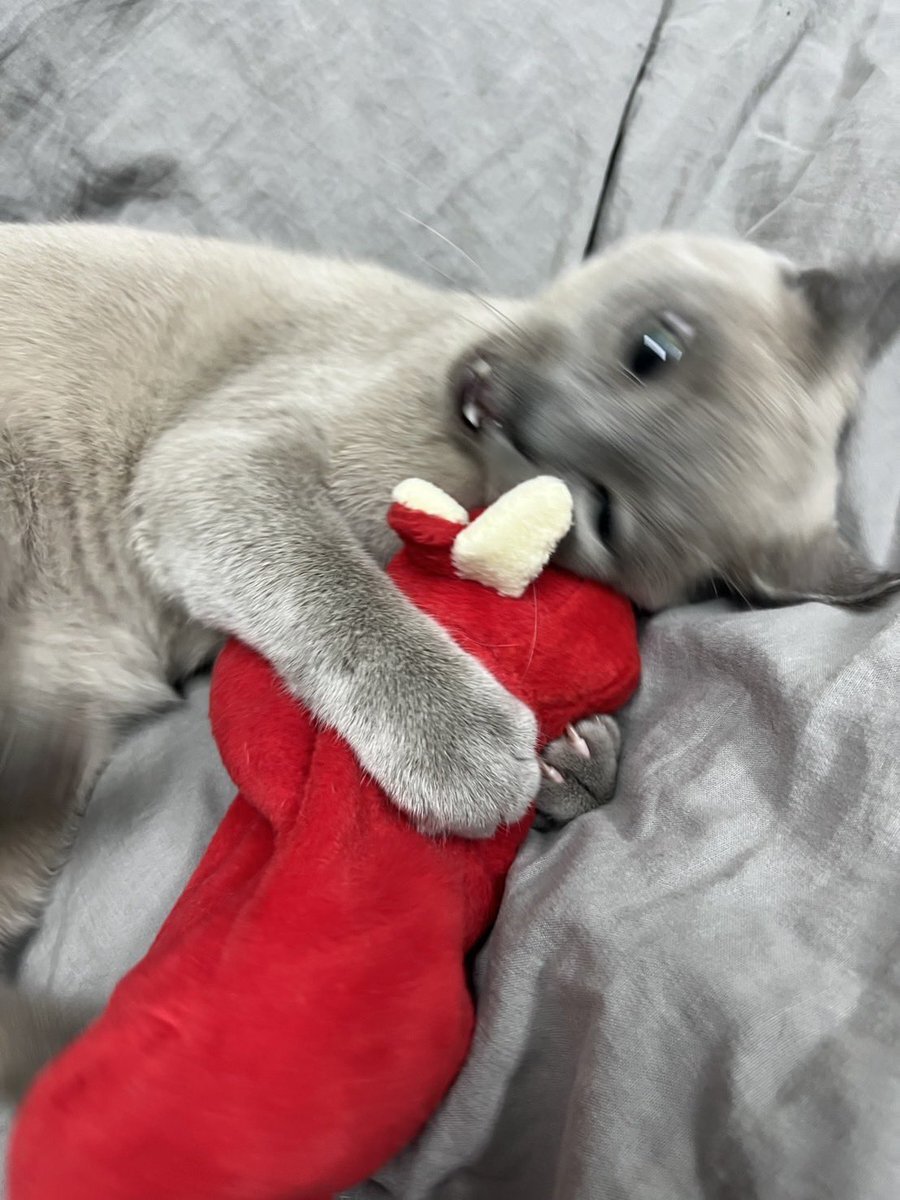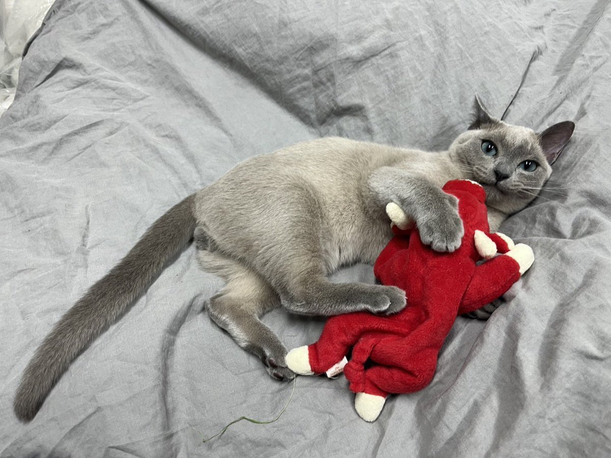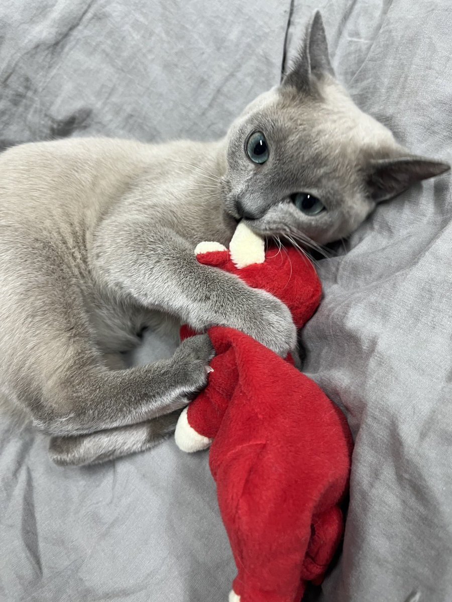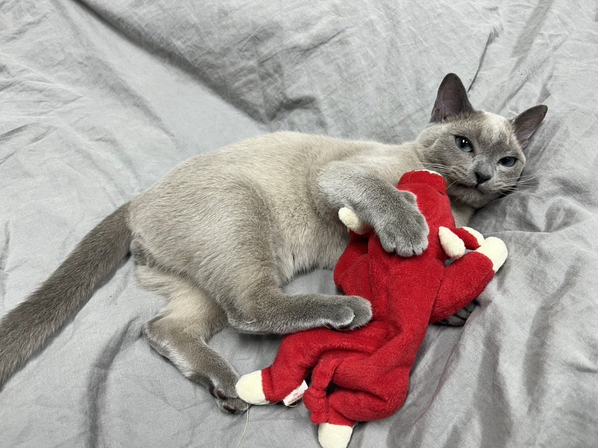 #運輸 よ、子モーちゃん(赤牛のぬいぐるみ)そんな乱暴にしないでょー、いつも一緒に寝ているでしょうが、、、 #猫 #トンキニーズ #Tonkinese #unyu pic.x.com/rO8TnwbqtU