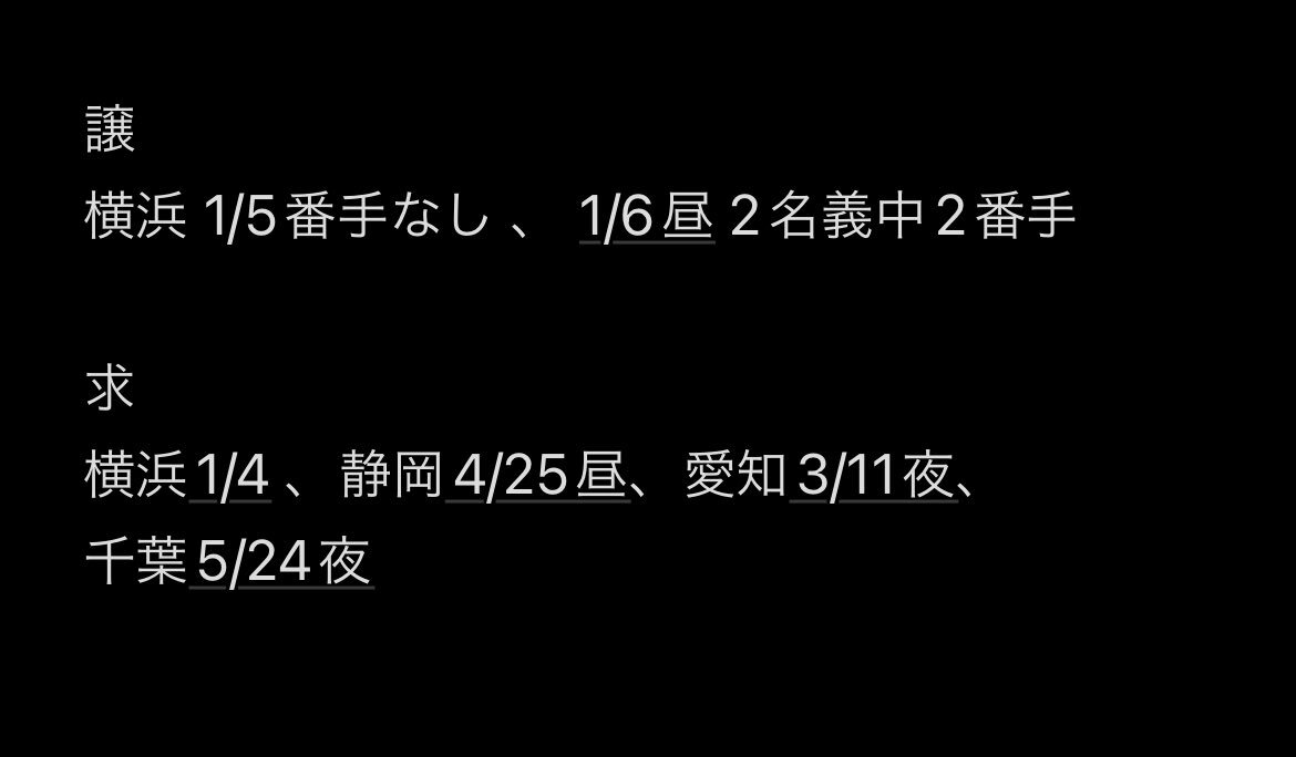 TravisJapan Concert Tour 2026 's travelersトラジャ 交換を探しております。 【譲】 横浜 1/6昼 3名義中3番手 【求】 横浜 1/7夜 2連ずつ。お心当たりのある方はご連絡お願いします #トラジャ求 #トラジャ譲 #トラジャ交換 #TravisJapan求 #TravisJapan譲