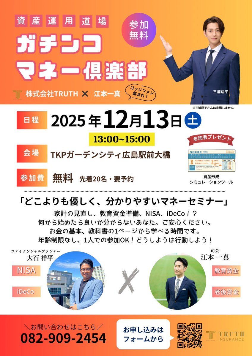 TRUTH主催スペシャルなイベント ▶▶ガチンコマネー倶楽部◀◀ #江本一真 が司会🔥 ☑️参加費無料 家計、教育費、NISA…気になるけど 敷居の高いお金の話もお任せ下さい! ゴッジリスナーも喜ぶエンタメ性抜群のイベントです! ⬇️お申し込みはコチラ docs.google.com/forms/d/e/1FAI… #ゴッジ