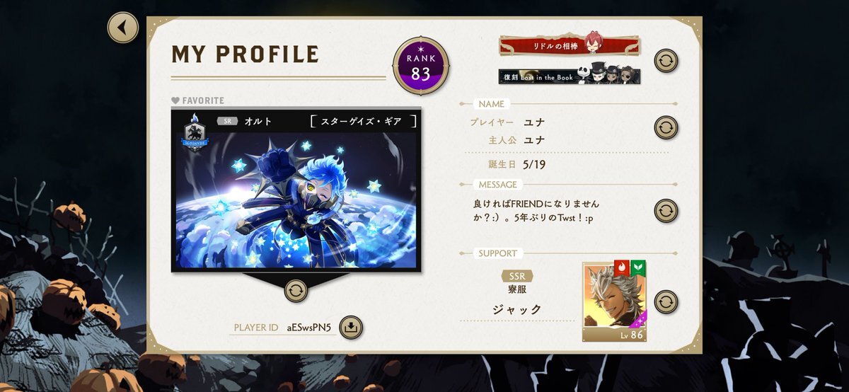 Twstのフレンド募集中です! 5年ぶりにゲーム開いてまたどハマりしました😆 仲良くしていただけると嬉しいです! #twst PLAYERSID:aESwsPN5 pic.x.com/iKR4egF2cP