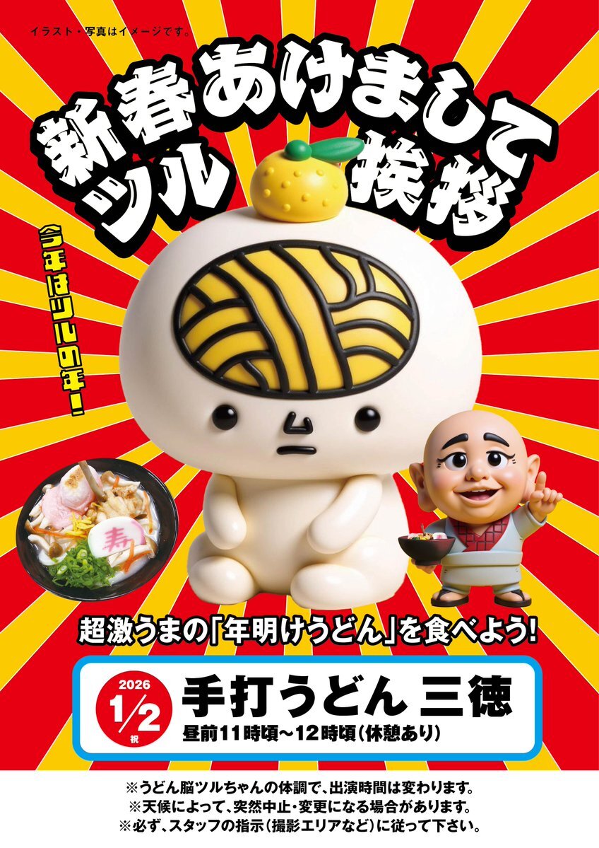 【イベント出演1/2★11時】 新年あけましてツル挨拶 《手打ちうどん三徳》 脳@)2026年は、うどんツルツル! ツルの年!! 早起きして「うどん」食べにきてなぁ〜♨ 超 #拡散希望 #UDON #うどん #うどん脳 Grokで立体化してみた pic.x.com/wKzKCGYmqM x.com/udonnoww/statu…