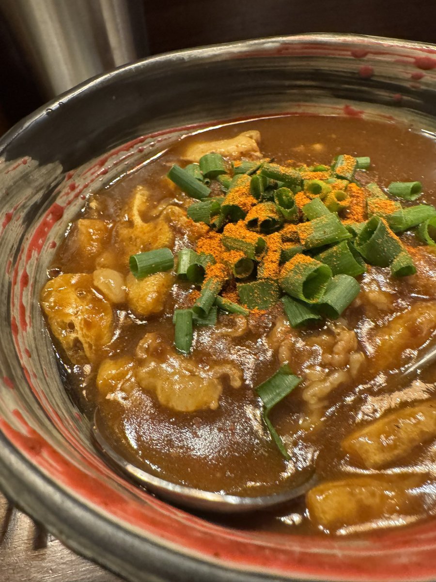 マッハさんお勧め、かすうどんの燕びさんの油かすは自家製!子持ちこんにゃく、小ネギ、たたききゅうり、伊勢屋のきつねをつまんだあと、油かす大盛りうどん、カレーうどん!めちゃくちゃ堪能しました! #udon #うどん #カレー #osakajapan #kitsune pic.x.com/wNzGXuqYAL