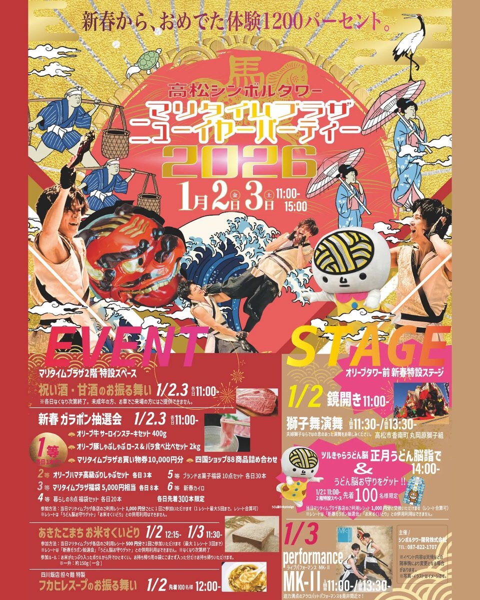 超 #拡散希望【イベント出演🥕1/2】 マリタイムプラザ ニューイヤーパーティー2026 《ご案内》 🥕今回もありますヒヒ〜ン うどん脳お守り!(11時〜 🥕うどん脳出没(14時〜 ♨詳しくは画像みてなぁ♨ #高松シンボルタワー #高松市 #TKMT #香川県
